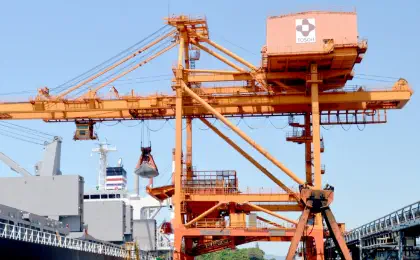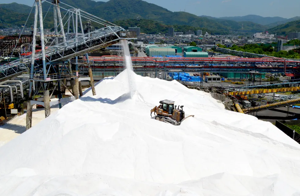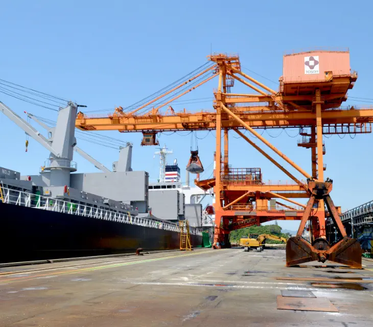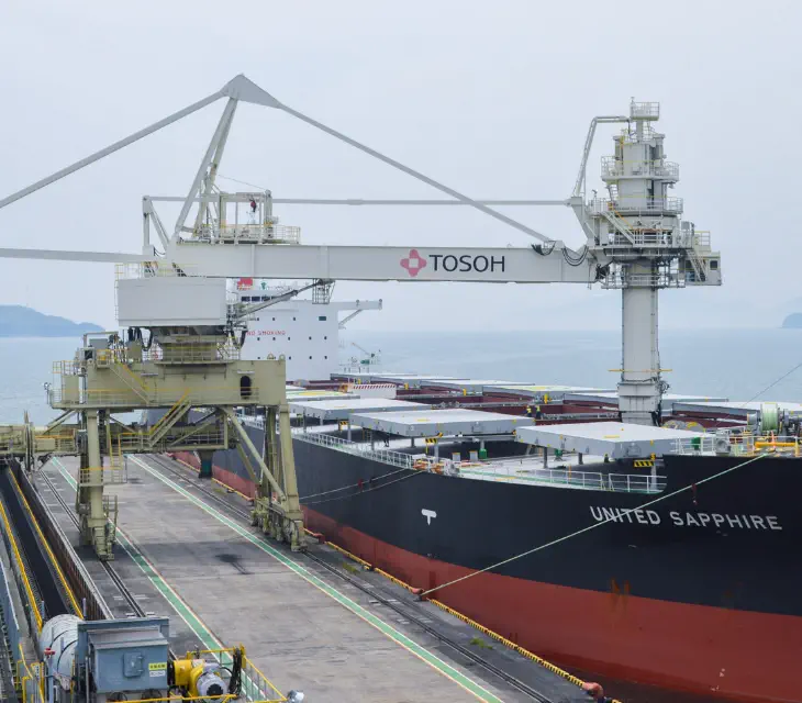大型クレーン(アンローダー、タイヤマウント式クレーン)を使用し、海外からの大型船より、原燃料(原塩・石炭)を荷役。