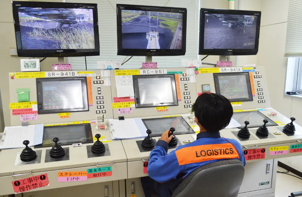 貯炭場にて、スタッカーリクレーマを使用しての供給作業