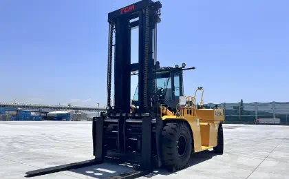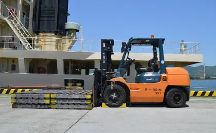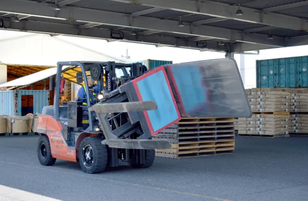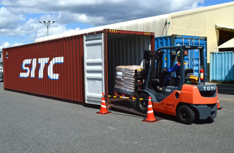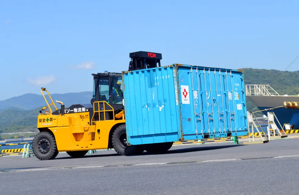 新南陽公共埠頭県営上屋にて、フォークリフトや大型重機(リーチスタッカー、24tフォークリフト)を使用し、