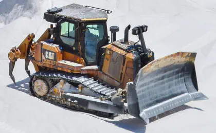 貯塩場にて、ブルドーザーを使用しての供給作業