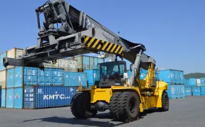 リーチスタッカーを使用してのコンテナ積み置き作業