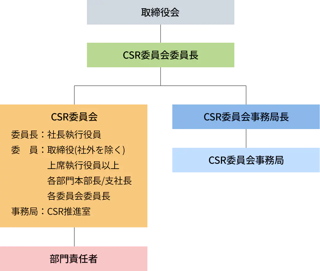 - 委員長は、社長執行役員が務め、CSR経営の統括責任者として、全社のCSR活動を統括しています。