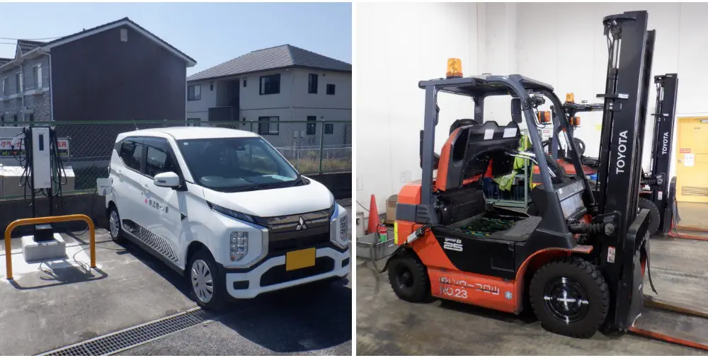 左:BEV及び充電設備(本社屋)、右:電動フォークリフト
