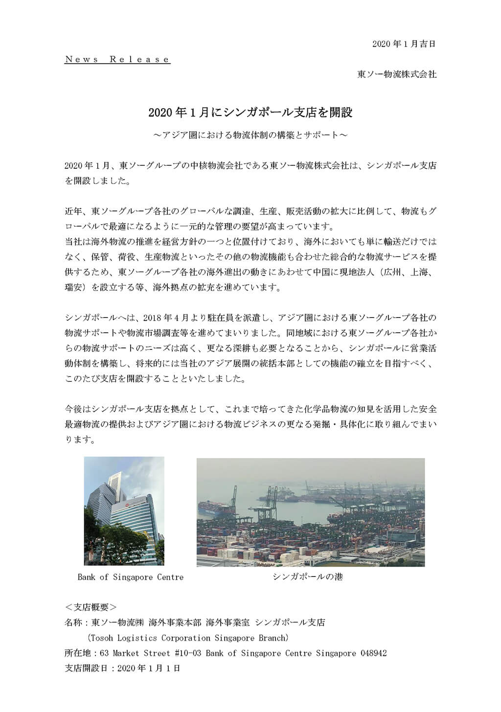 2020.02.01 お知らせ 2020年1月にシンガポール支店を開設 2020年1月、東ソーグループの中核物流会社である東ソー物流株式会社は、シンガポール支店を開設しました。 2020年1月にシンガポール支店を開設(PDF)