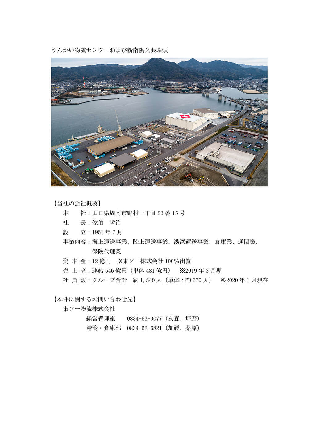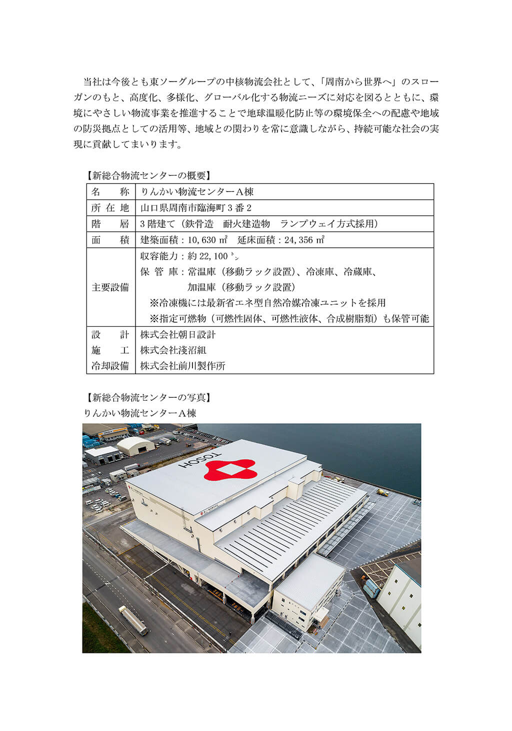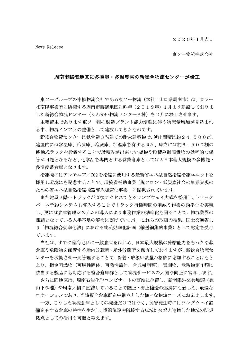 東ソーグループの中核物流会社である東ソー物流(本社:山口県周南市)は、東ソー(株)南陽事業所に隣接する周南市臨海地区に昨年(2019年)1月より建設しておりました新総合物流センター(りんかい物流センターA棟)を2月に竣工させます。