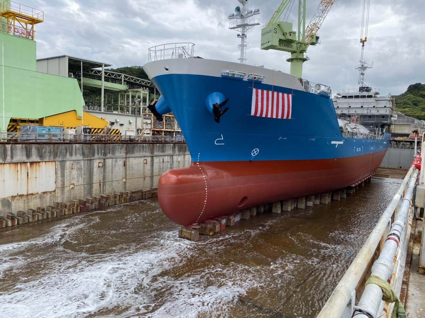 2020年5月15日(金)下ノ江造船株式会社(大分県臼杵市)において、新造エチレン船の進水式が執り行われました。式を執り行うにあたり、昨今の社会情勢を踏まえ、少人数での開催となりました。