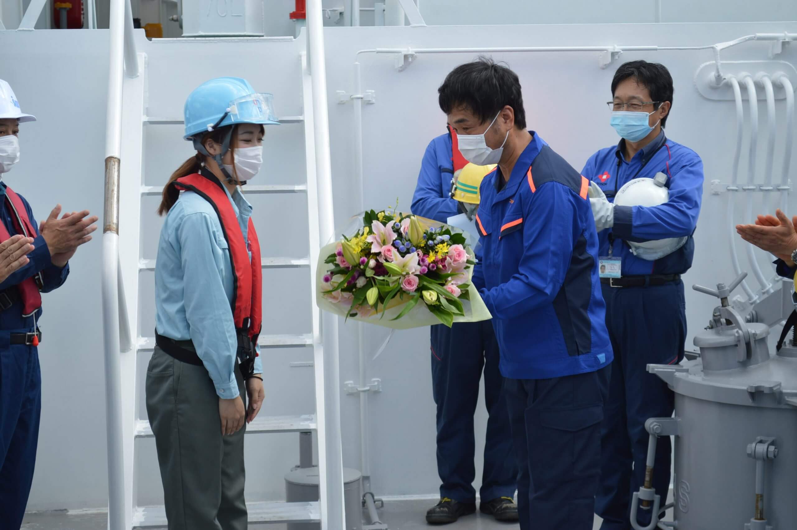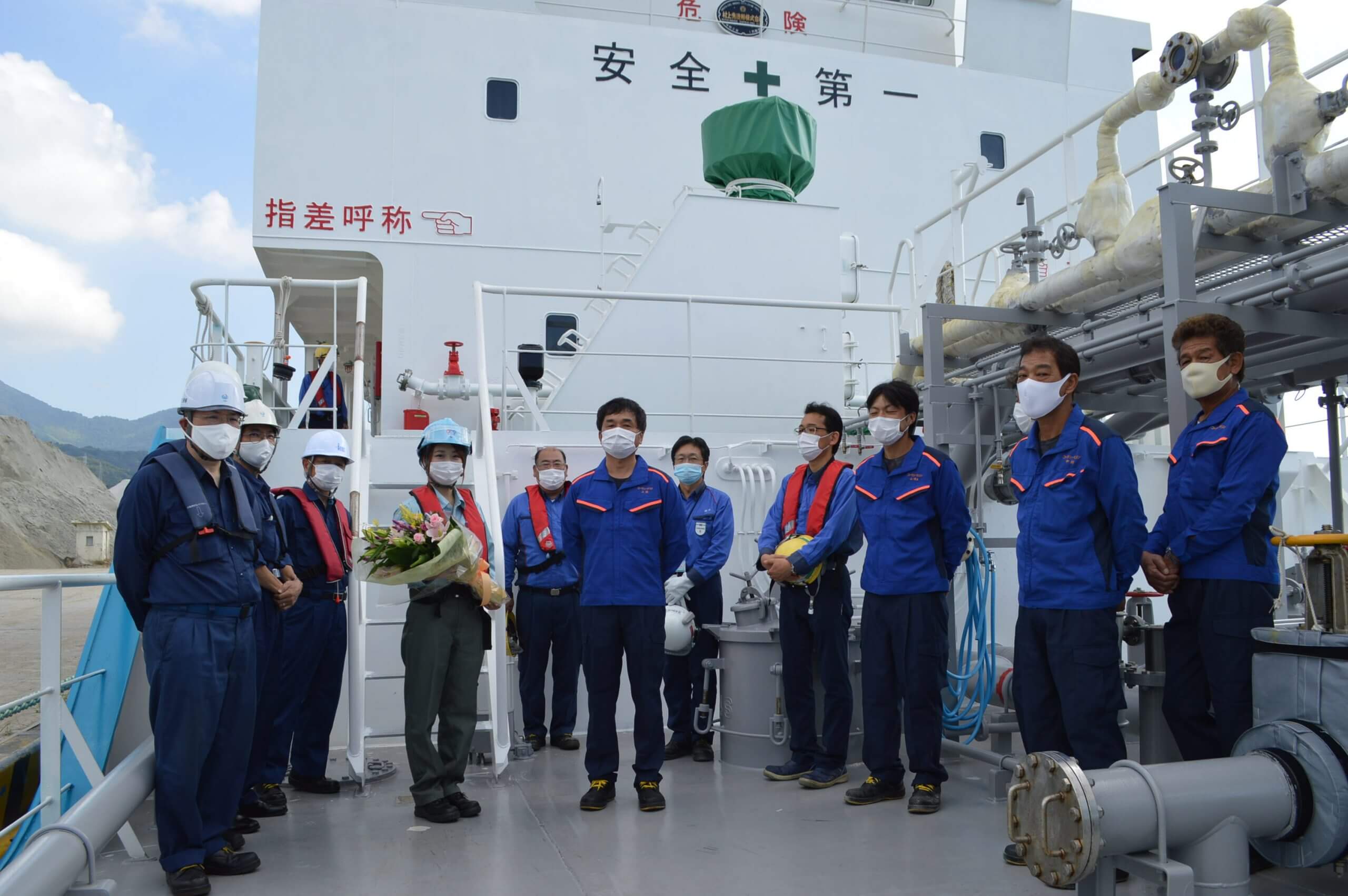 はじめに、コーウン・マリン(株)の液体苛性船「東駿丸」にて、東ソー(株)事業所長室 物流G立会いの下、月間スローガンの周知と安全衛生の推進についての依頼があり、(株)トクヤマ 徳山製造所の三戸さんより、船長の上領さんに花束が手渡されました。