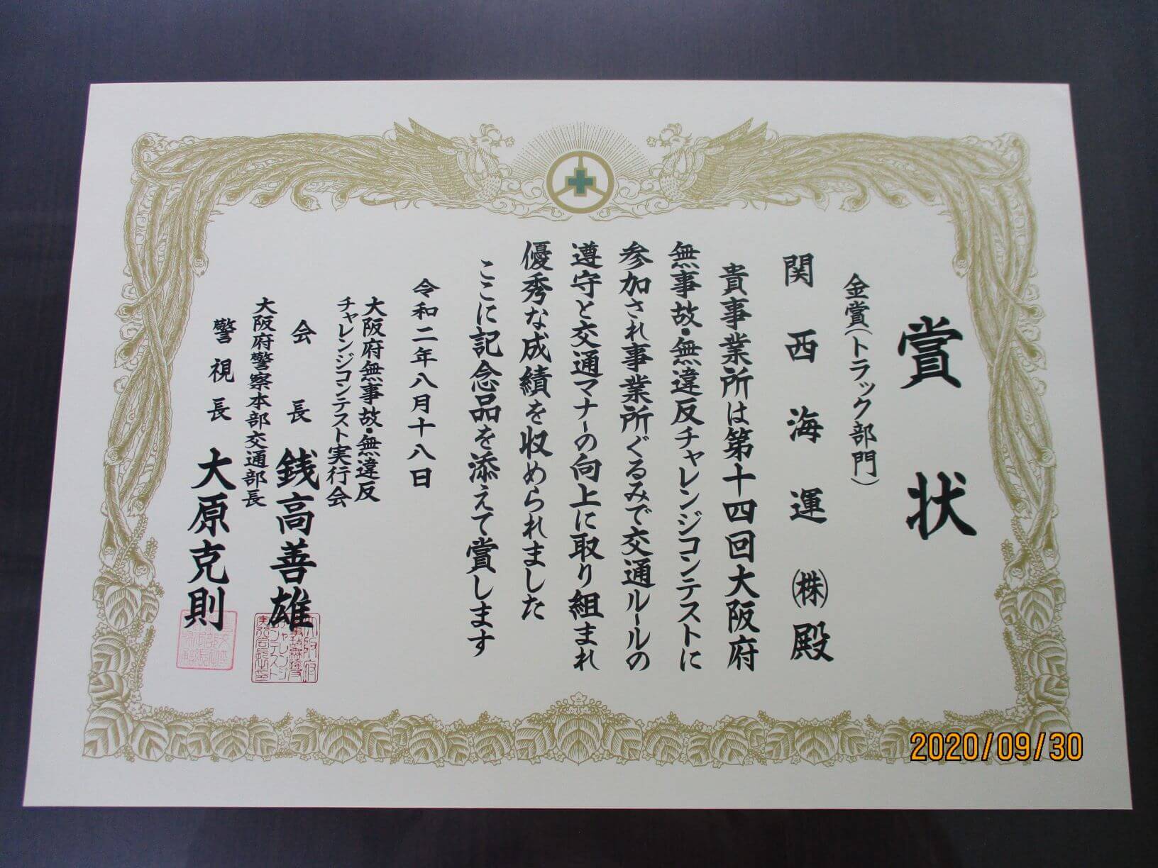 関西海運㈱ 大阪府無事故・無違反チャレンジコンテスト金賞受賞
