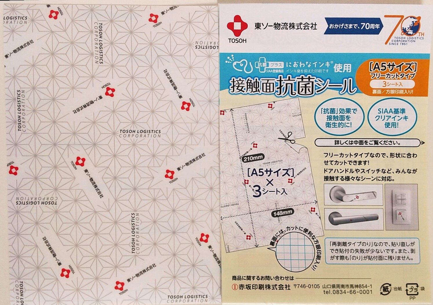 創立70周年記念グッズとして、社名入り抗菌シールを製作いたしました。