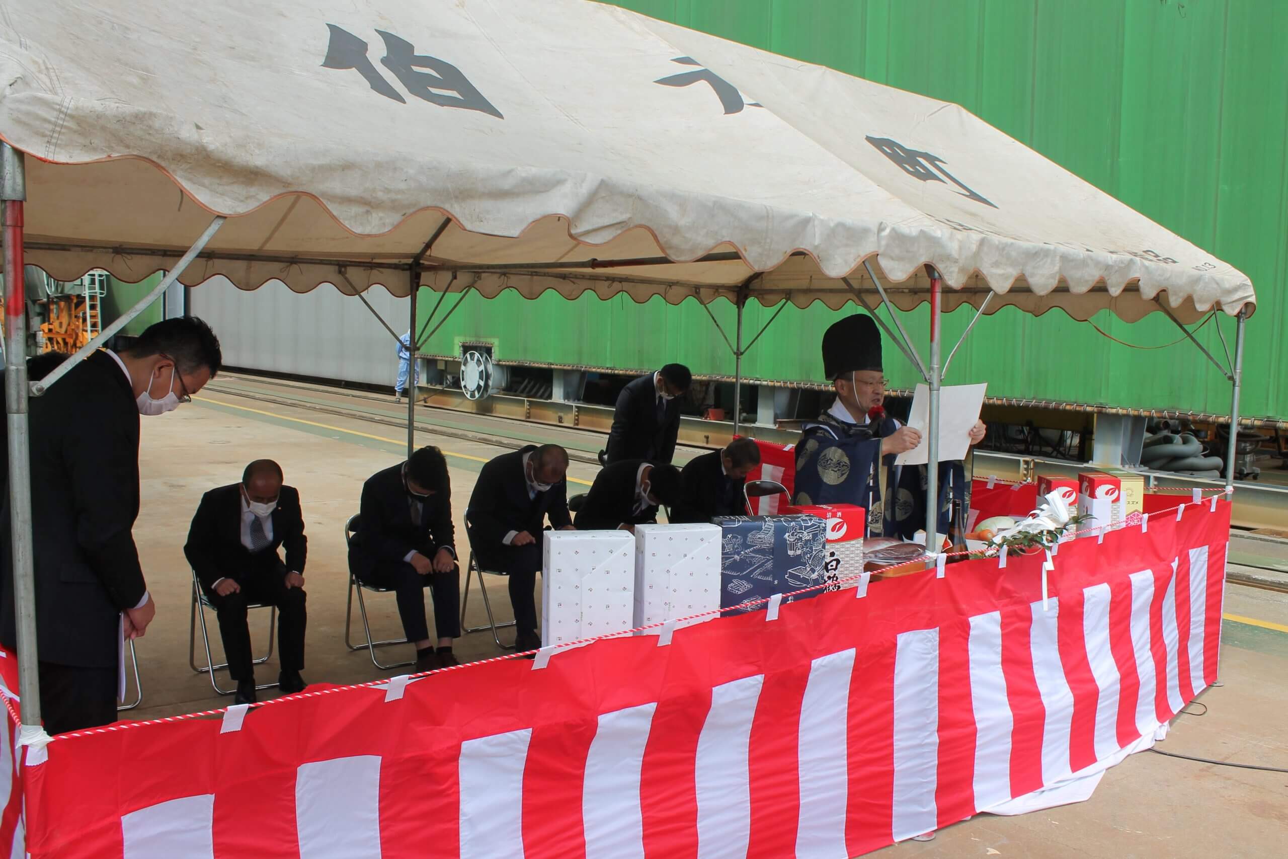 同船の進水式の際と同様、コロナウイルスによる社会情勢を踏まえ少人数にて行われ、神主様及び関係者参列の下、本船の安全運航を願い執り行われました。その後本船は試運転を行った後、徳山港へ向け造船所を出港し、4月21日(水)には東ソー株式会社南陽事業所にて関係者各位が見守る中、安全に着桟し、初荷役は順調に行われ、目的地へ向け徳山を出港致しました。