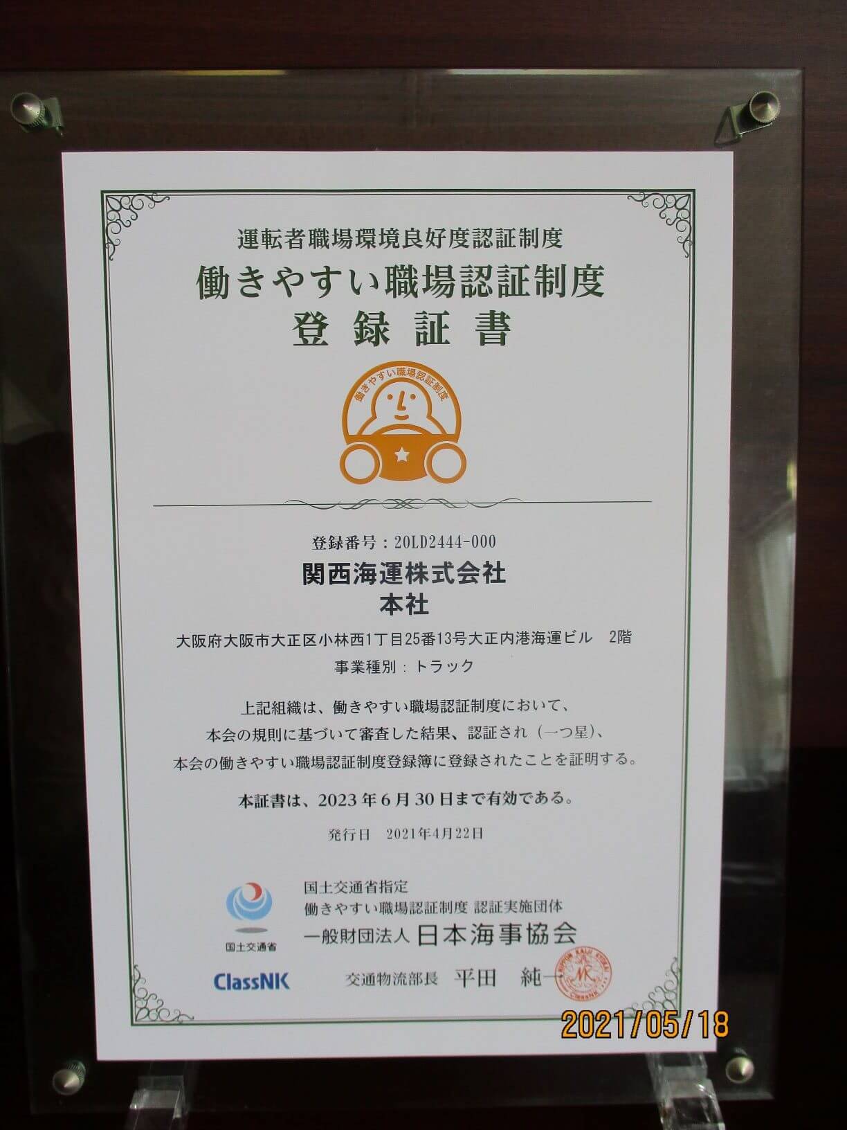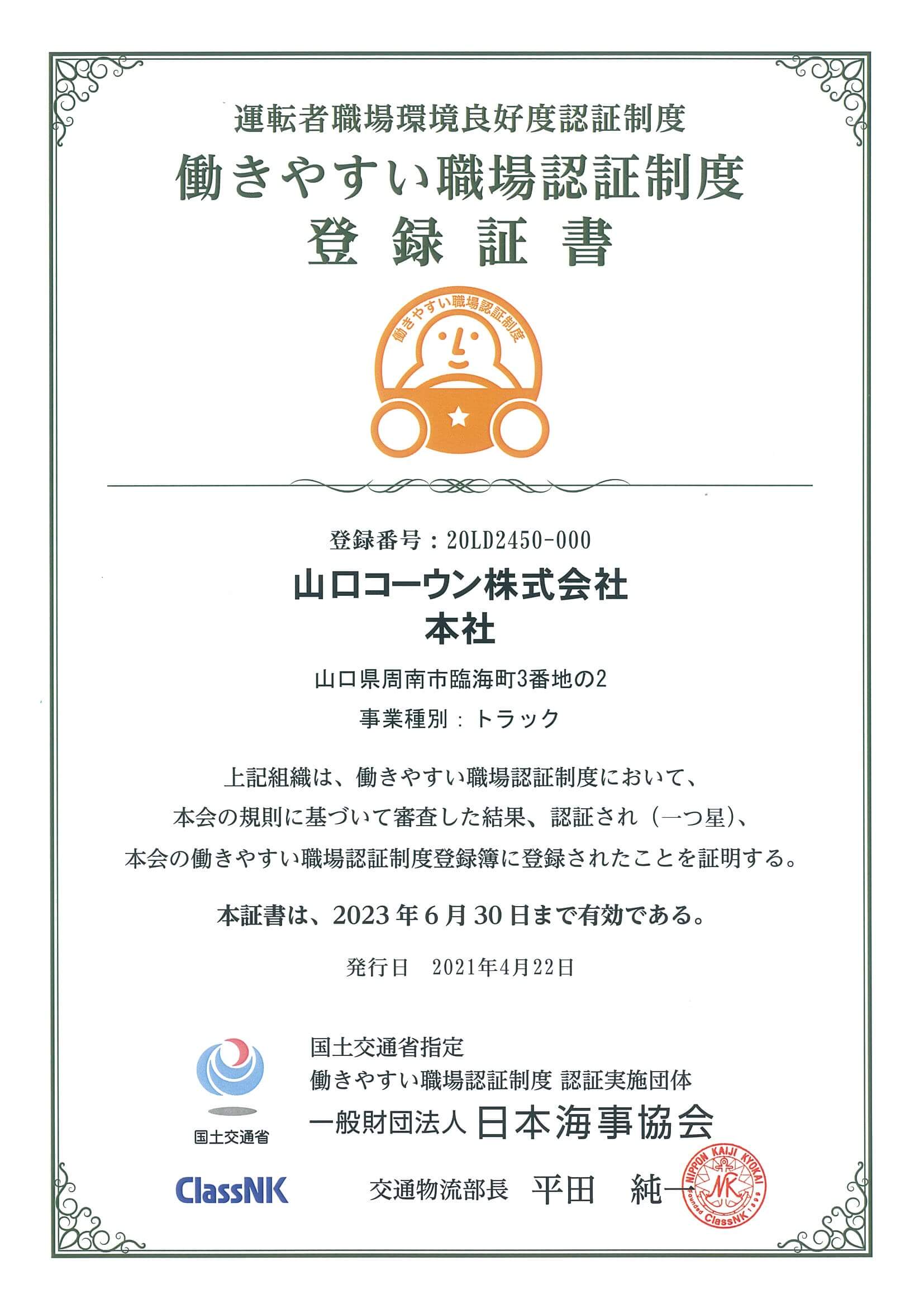 当社グループ会社で自動車運送事業を担っている、山口コーウン株式会社並びに関西海運株式会社で、「運転者職場環境良好度認証制度(愛称:働きやすい職場認証制度)」の「一つ星」の認証を取得しました。