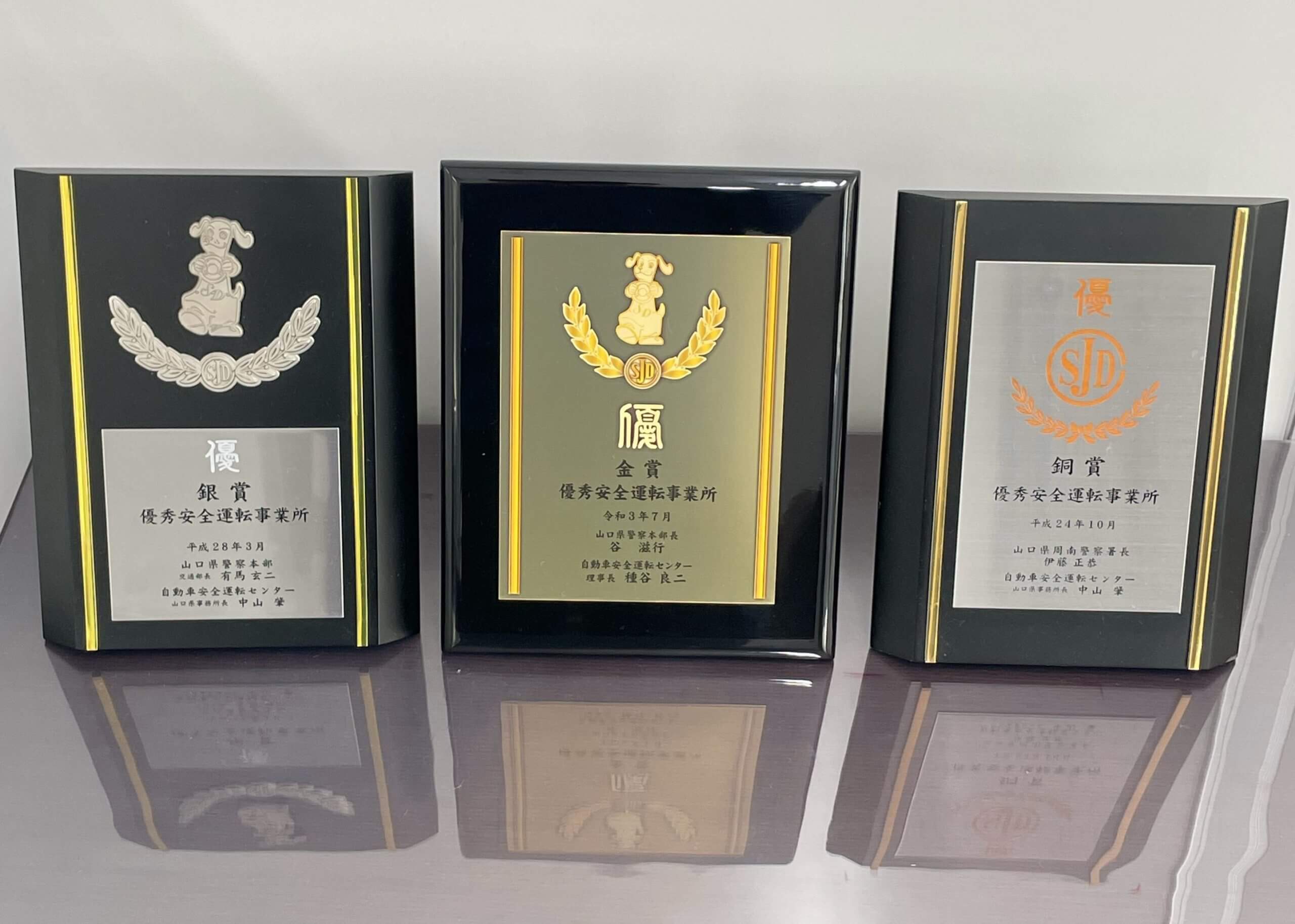 この表彰は、自動車安全運転センターから交付される「運転記録証明書」をもとに1年間の交通違反や事故件数を基準に照らし合わせ、違反率の少ない事業所に贈られる賞です。山口コーウン㈱として、2012年に銅賞・2016年の銀賞に続き、今年金賞を受賞し目標としているプラチナ賞に1歩近づきました。乗務員ひとり一人が業務中、プライベートを問わず、日頃から人にやさしい運転を意識できた成果と確信しています。