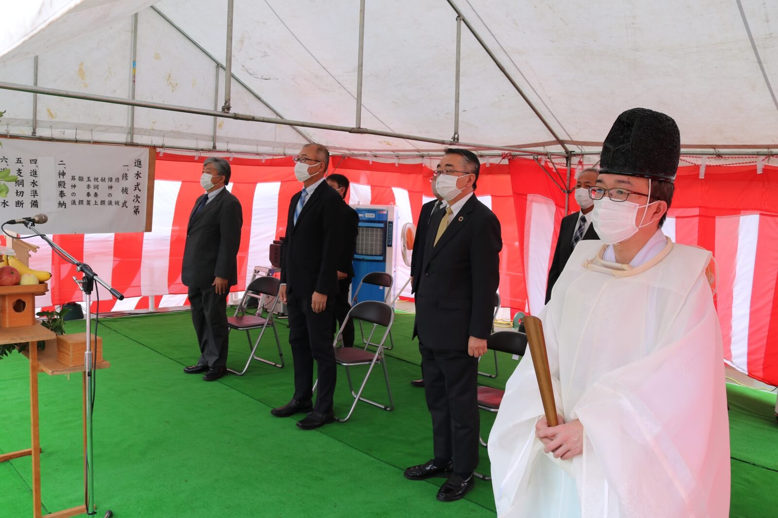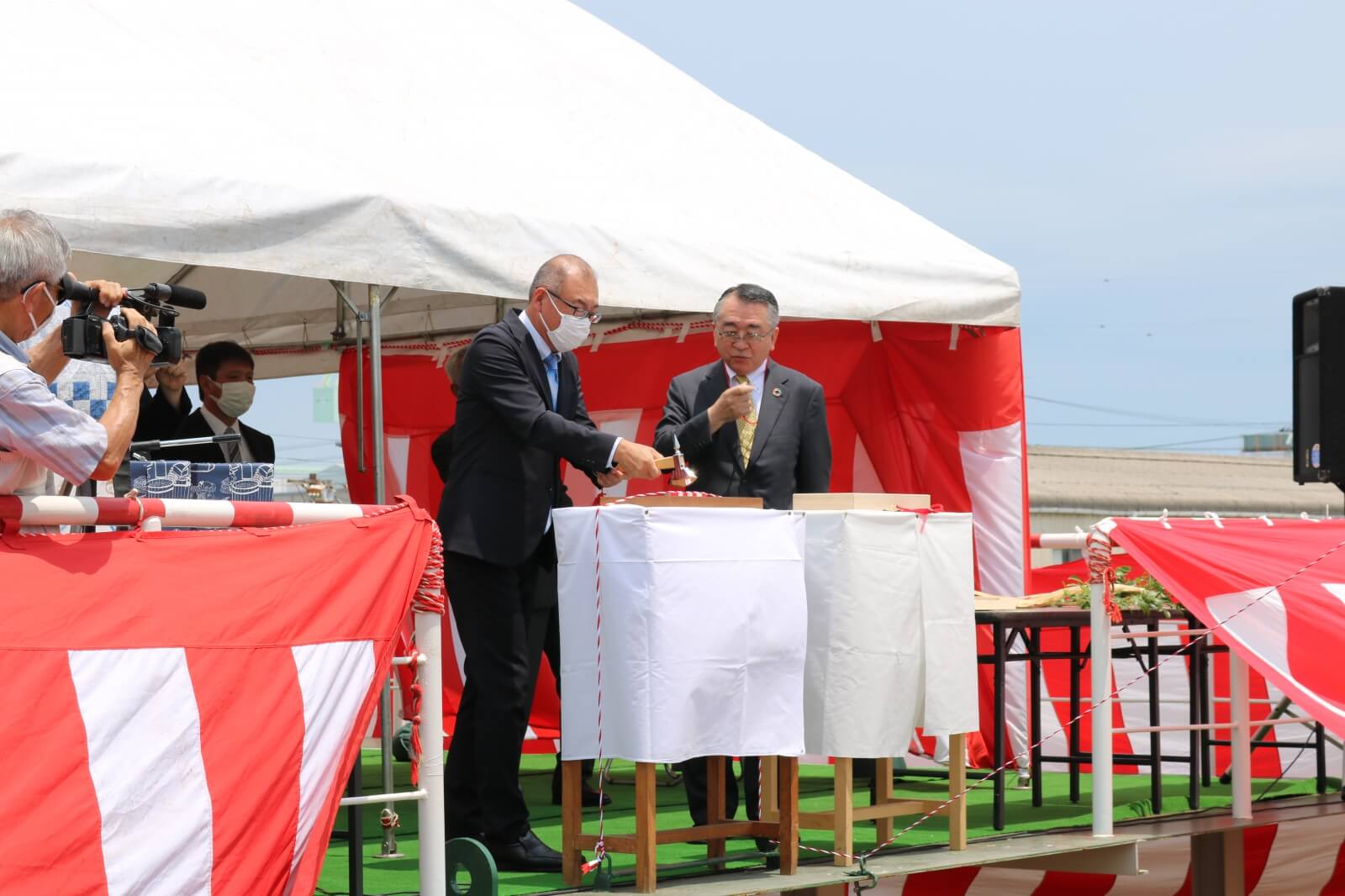 2021年7月12日(月)、興亜産業株式会社(香川県丸亀市)において、液体苛性ソーダ運搬船の進水式が執り行われました。式は昨今の社会情勢を踏まえ、少人数での開催となりました。最初に神主さんのご祈祷など修祓式とよばれる神事、次に船長によって神殿奉納が行われ、その後いよいよ進水です。