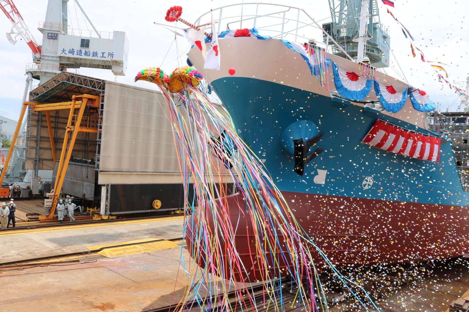 支綱切断と同時にシャンペンボトルとくす玉が割れカラフルな紙テープと共に、ゆっくりと船尾から着水しました。