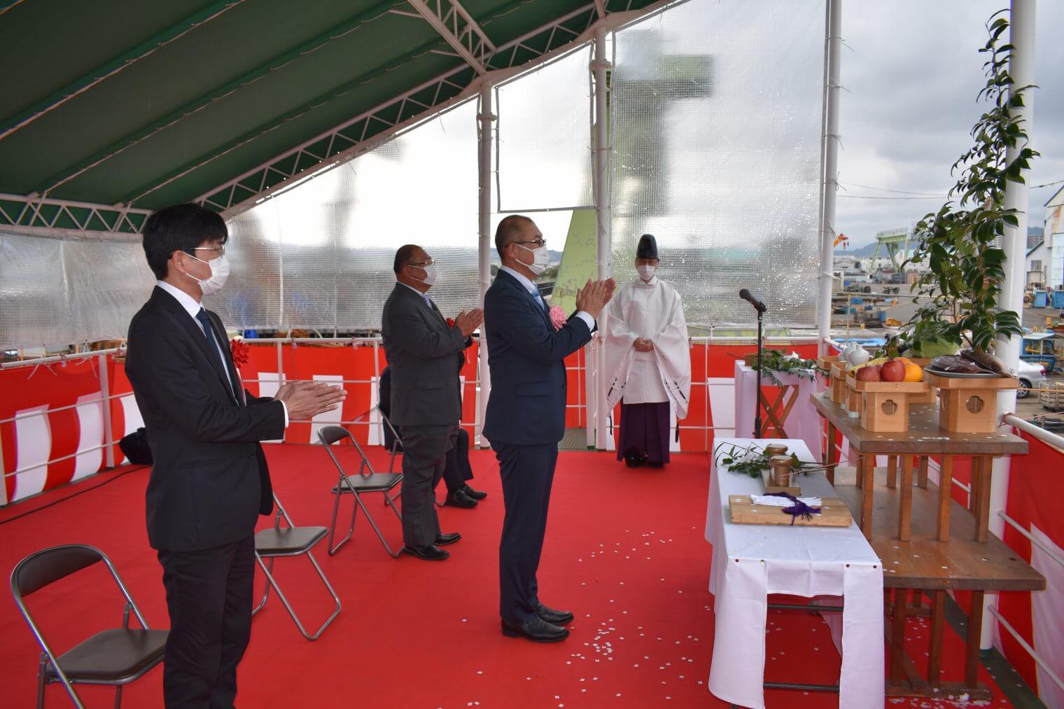 2022年3月30日(水)、株式会社カナサシ重工(静岡市)において、液体苛性ソーダ運搬船の進水式が執り行われました。式はコロナ感染状況を踏まえ少人数での開催となりました。最初に神主さんのご祈祷など修祓式とよばれる神事が行われ、その後塚本執行執行役員の支綱切断と同時にシャンペンボトルとくす玉が割れカラフルな紙テープと共に、富士山をバックにゆっくりと着水しました。桜満開の晴れやかな天気のもと無事式は執り行われました。今後本船は艤装を行い、7月下旬に竣工となります。