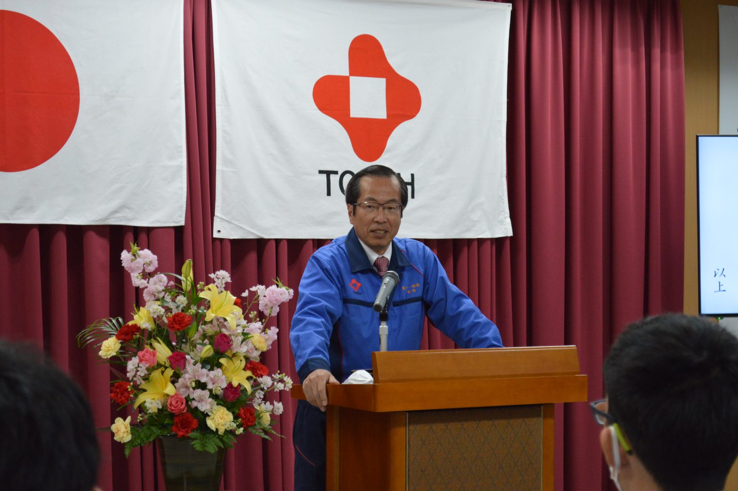 辞令交付が行われた後、佐伯社長があいさつし「入社おめでとう。東ソー物流グループを選んでくれてありがとうございます。大変うれしく思います。」と述べました。