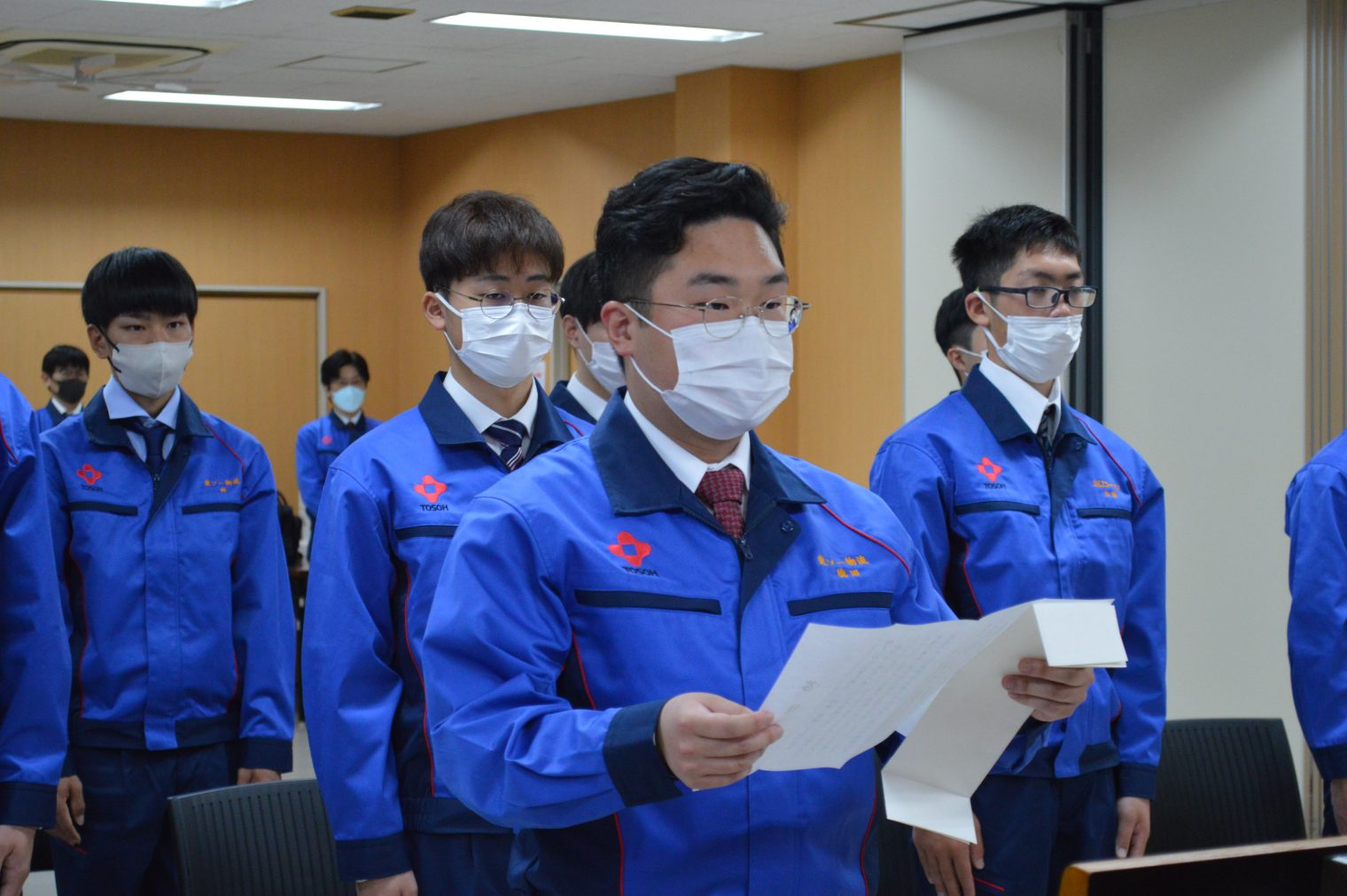 その後、新入社員を代表して德田 晋平さんが「一人の社会人としての責任を忘れず、会社の発展に貢献できる人材になれるよう努力いたします。ご指導よろしくお願いします。」と決意のことばを述べました。