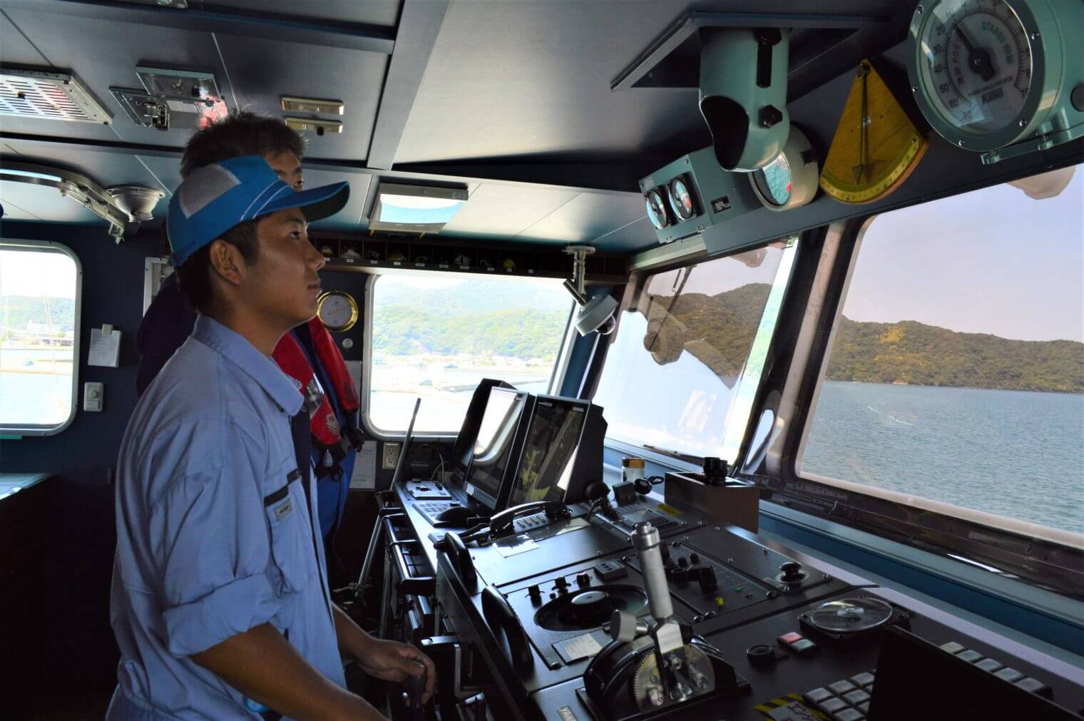 係船機・航海計器・主機については実際に作動させた上で操作方法・仕組みを伝え、航海中の雰囲気を疑似体験しました。特に操舵室では、船の周囲を観測出来るライブカメラ映像を操作・見学し、安全運航に配慮している点に関心が集まり、最新技術に目を輝かせながら学んでいきました。