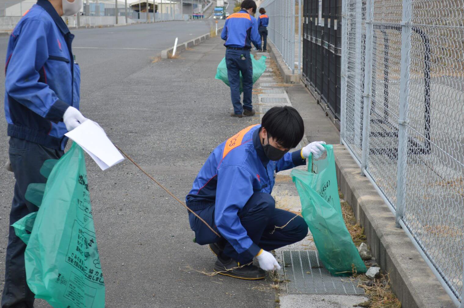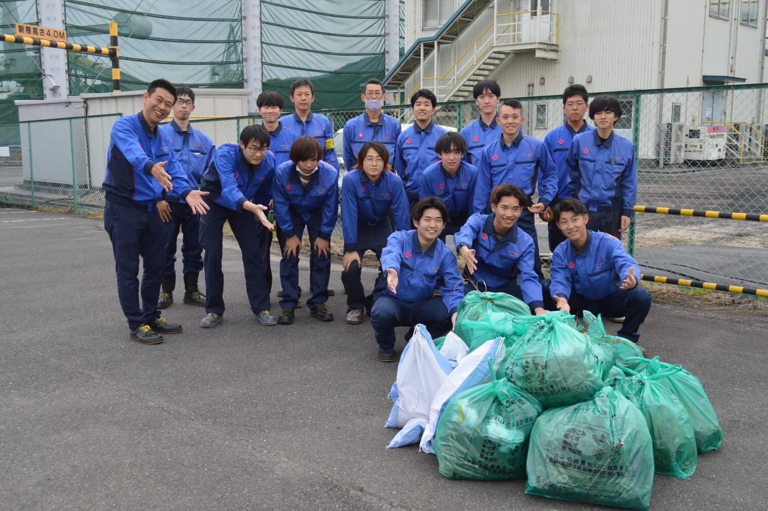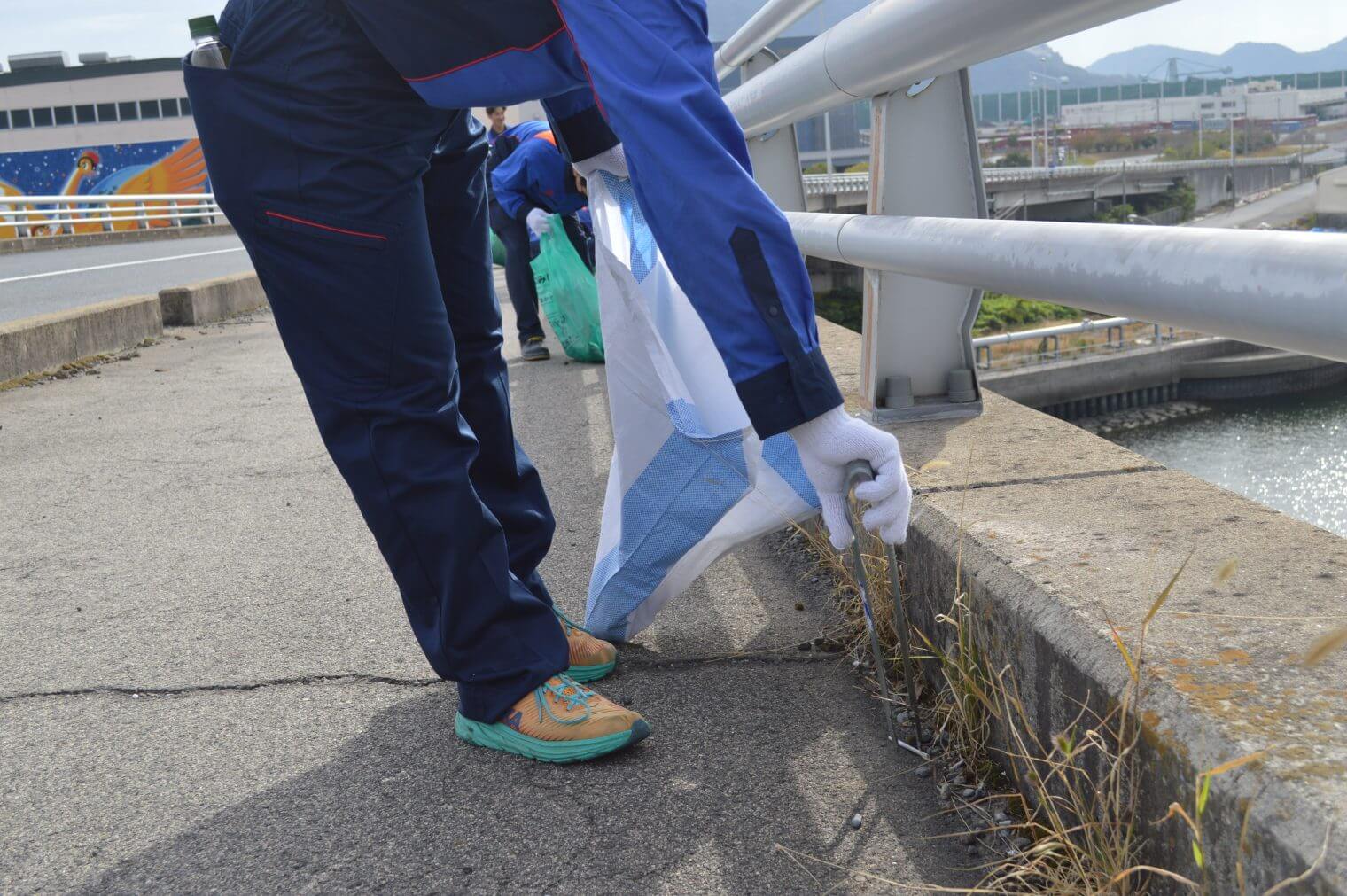 東ソー物流グループからも今年度入社の社員など19名が参加し、東ソー㈱南陽事業所の西門から周南大橋にかけて、ゴミ袋と火ばさみを手に歩きながらゴミを拾い集めました。