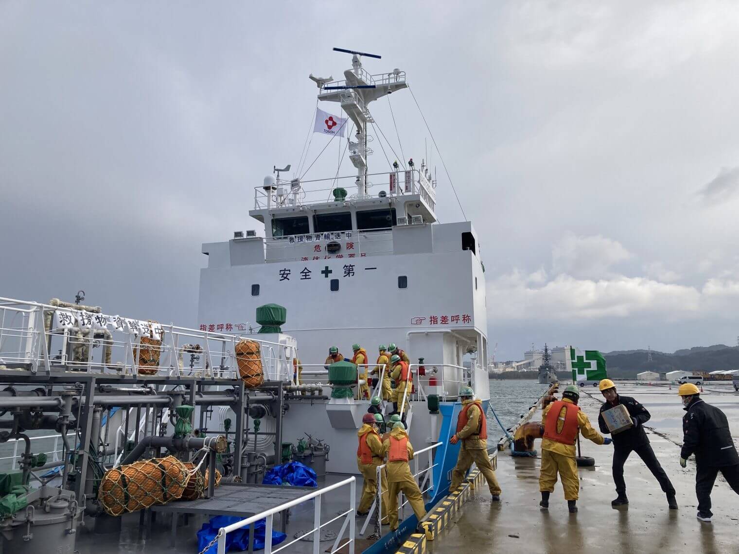 東ソー㈱、当社、コーウン・マリン㈱から被災地への支援物資を緊急輸送していた社船「東駿丸」は、12日(金)七尾港に入港し、七尾市役所に物資をお届けいたしました。