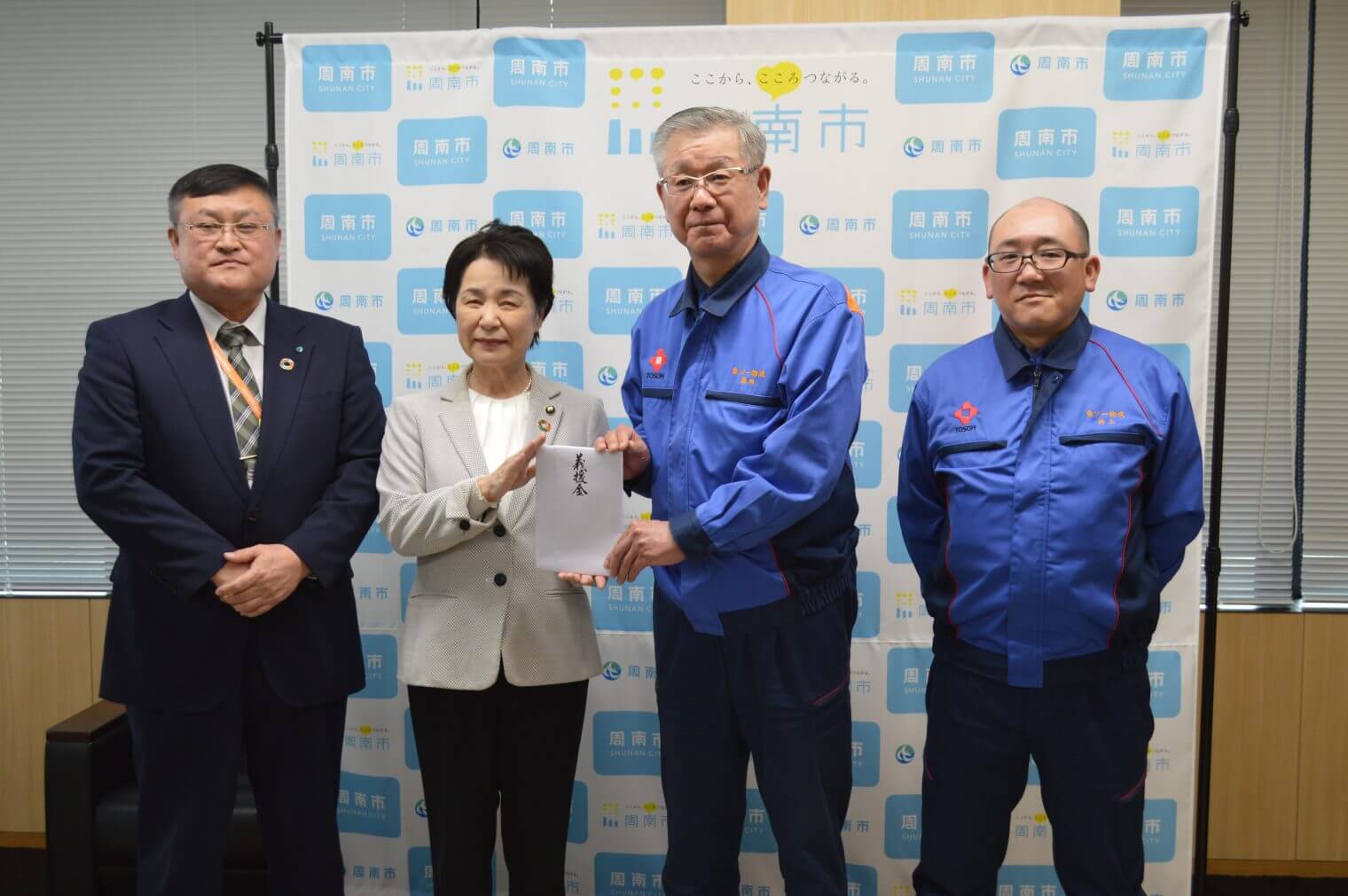 周南市役所にて日本赤十字社 山口県支部周南地区地区長である、藤井律子市長に目録を贈呈しました。