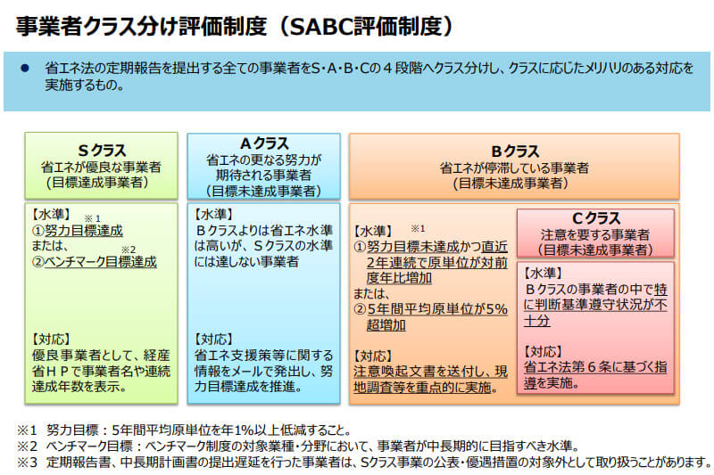 事業者クラス分け評価制度とは、総合資源エネルギー調査会省エネルギー小委員会の取りまとめに沿って、省エネ優良事業者を公表することで事業者に自らの省エネ取組状況の客観的な認識を促すことを目的として実施されているものです。