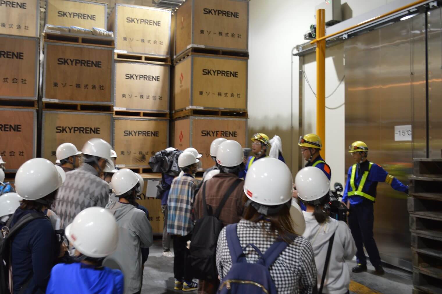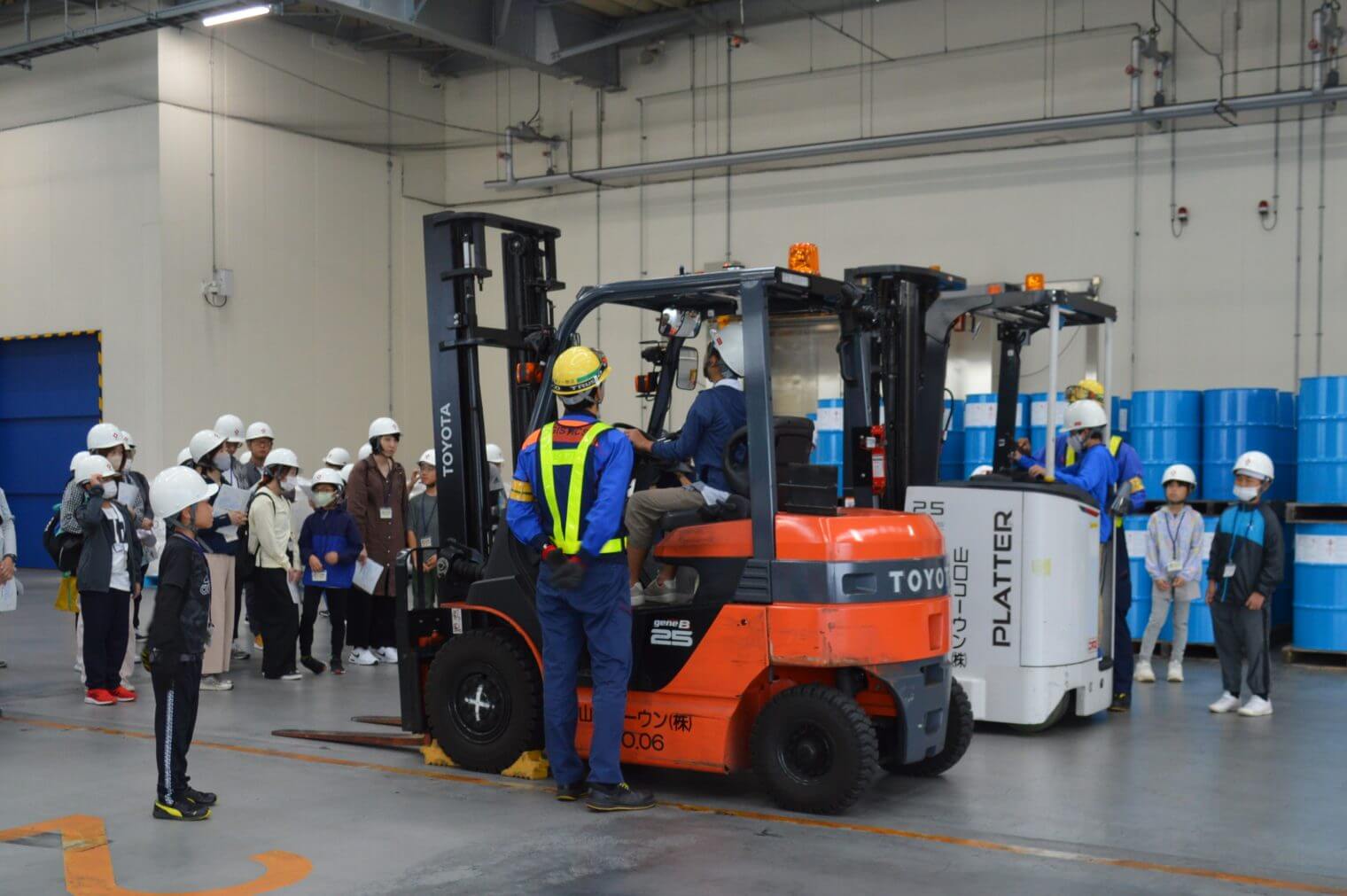 りんかい物流センターA棟では、フォークリフトの乗車体験や、マイナス15度の冷凍倉庫の中で一瞬で濡れたタオルが凍る実演をしました。