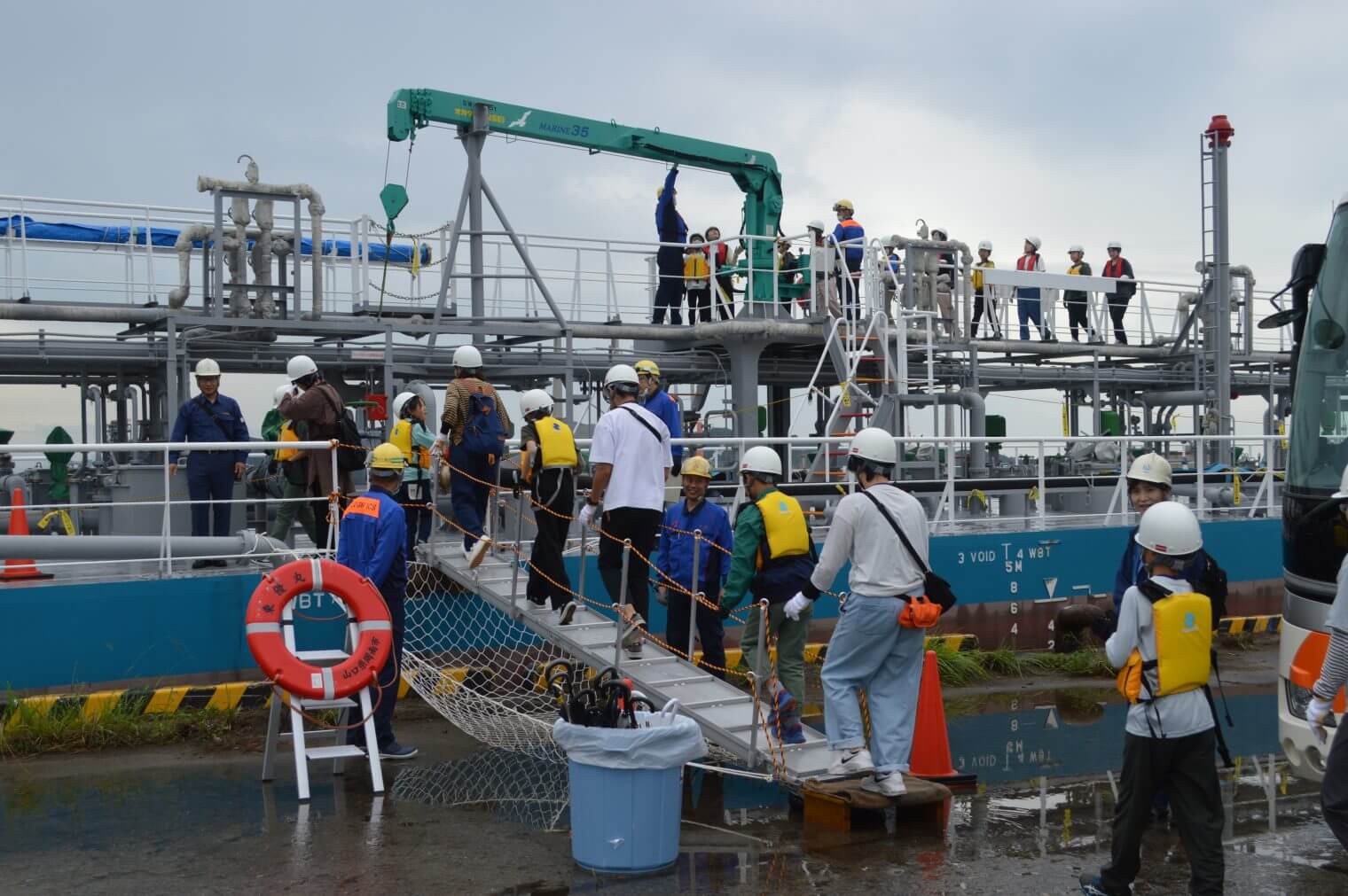 7月24日(水)、産業観光ツアーの一貫で県内の親子20組40名が当社りんかい物流センターA棟および苛性ソーダ運搬船「東優丸」に見学にいらっしゃいました。