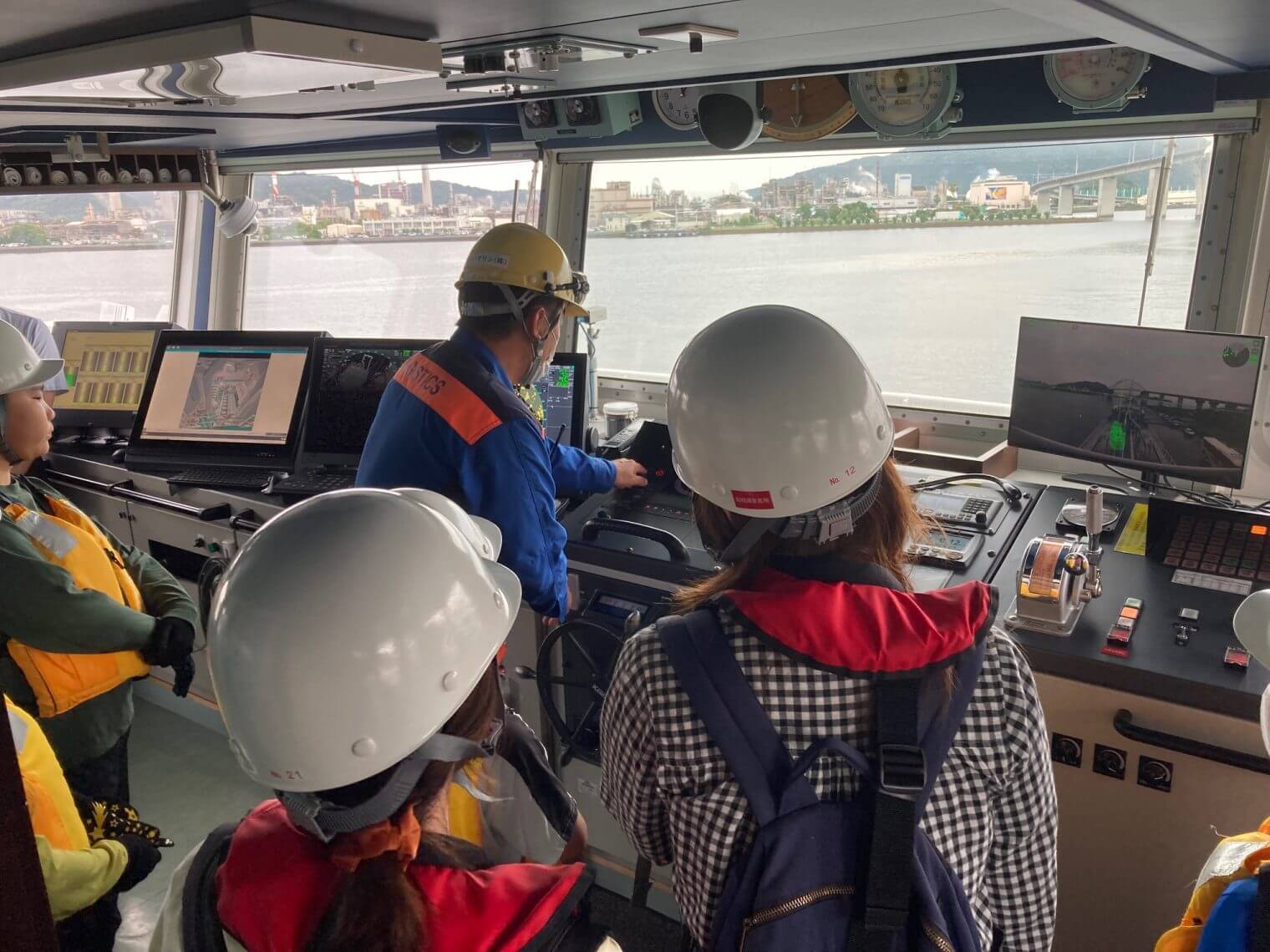 その後、最寄りの平野公共岸壁へ移動し、東優丸の見学を行いました。本船では、船首での記念撮影会や船員による船内説明などが行われ、特に操舵室ではレーダーや電子海図などの充実した装備を興味深く見学されました。