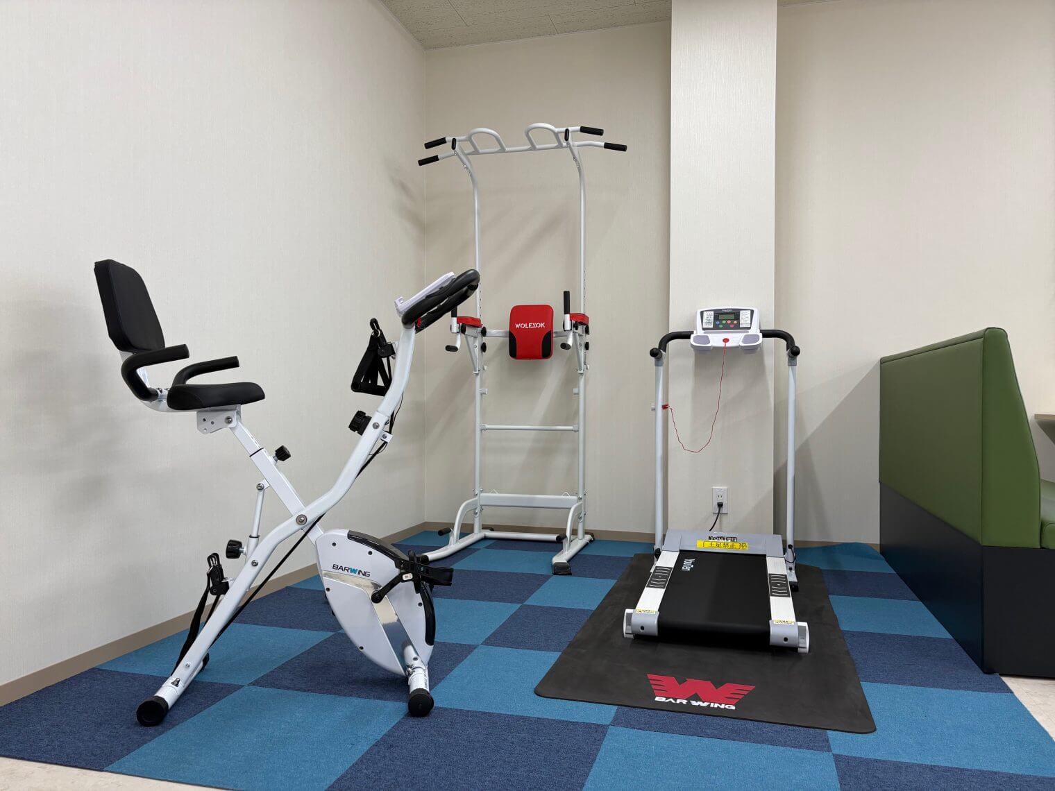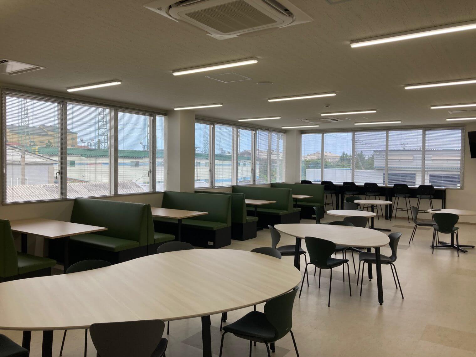 力を入れた箇所は休憩室です。カフェ仕様にファミレスブースを設置しゆったりと横になれるスペースを確保。また、ランニングマシーンやぶら下がり健康器などの健康器具を設置し、従業員の健康意識向上を図っております。
