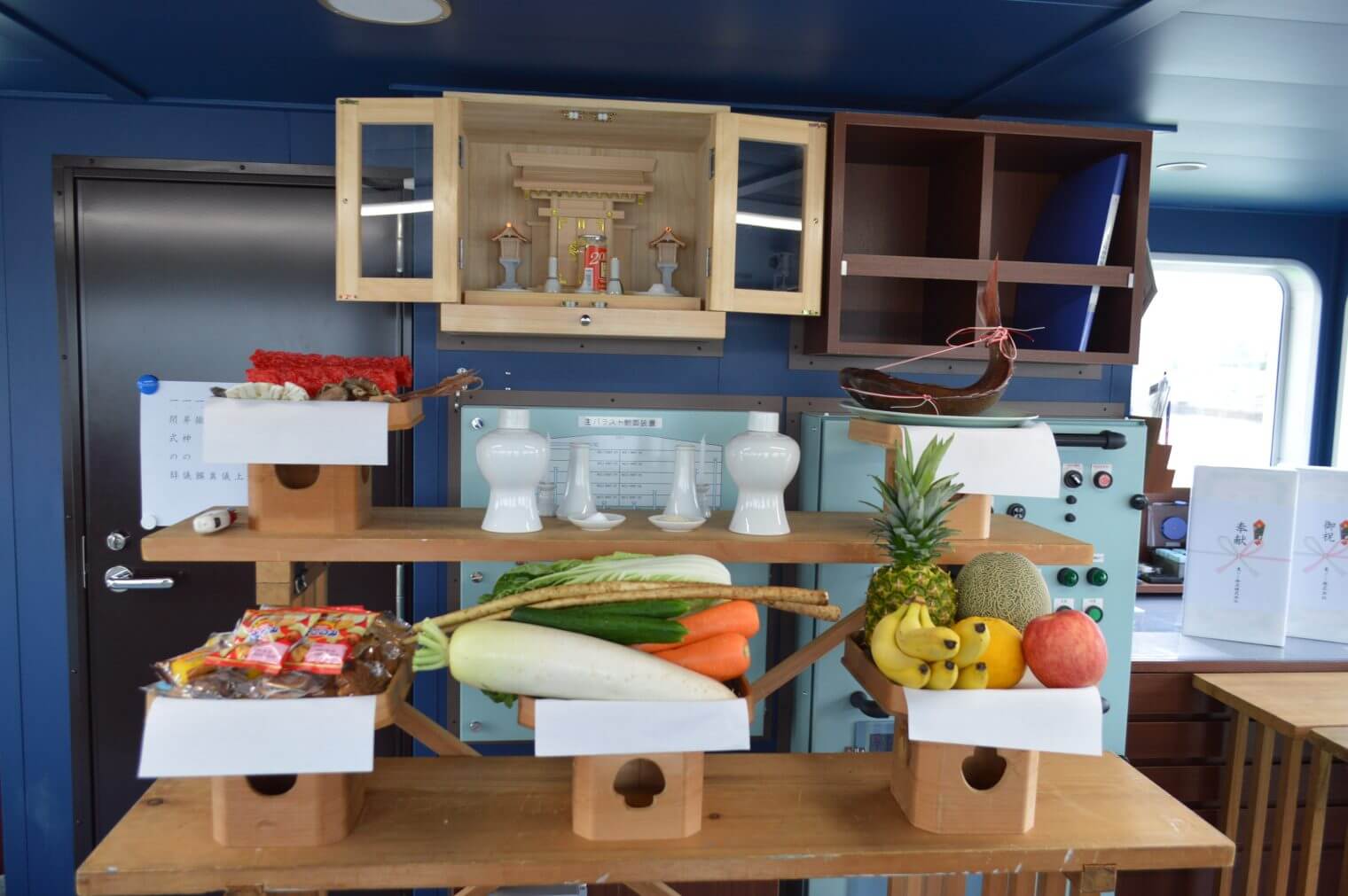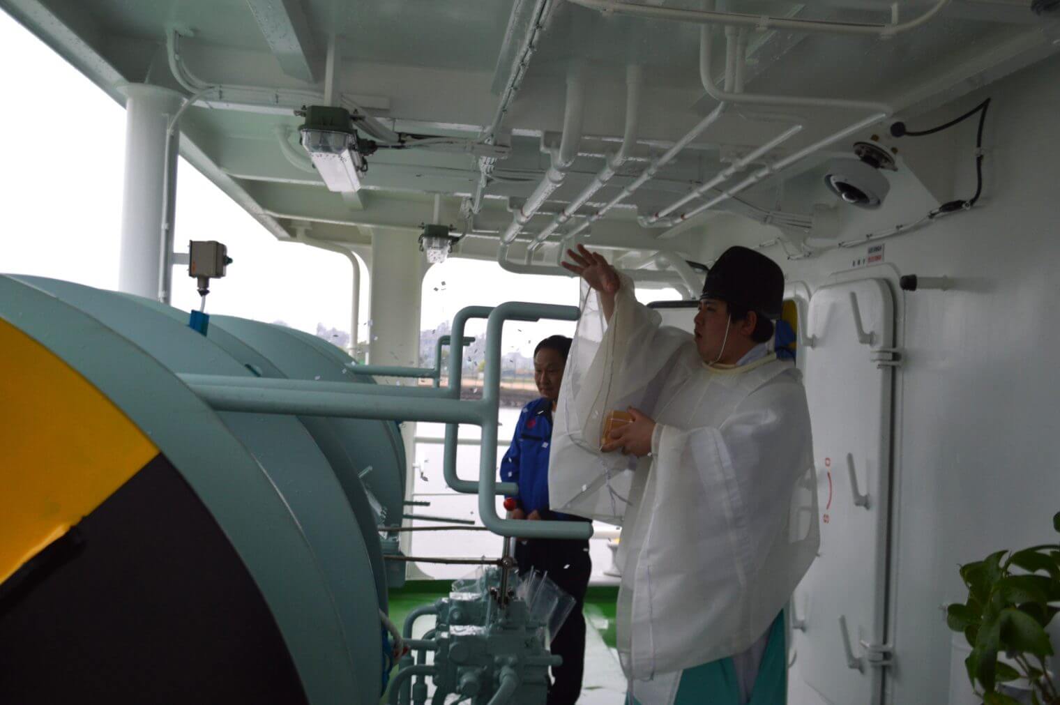 6月9日(月)には、平野埠頭で本船の安全航行祈願祭を行いました。ブリッジに祭壇を設置し、神職による祝詞奏上や清祓いが厳かに行われ、玉串を奉奠し、参加者一同が航海の安全を祈念しました。