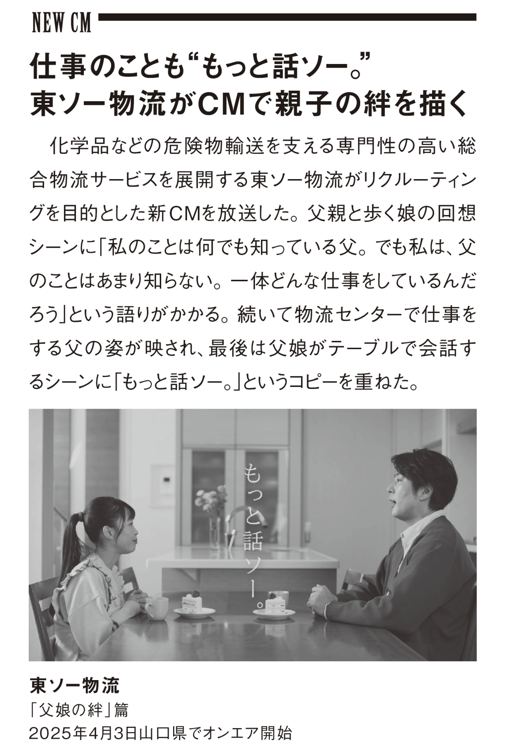 2025.06.23 お知らせ CM専門誌に東ソー物流のCMが掲載される! 4月より放映を開始した当社の新CMが、CM業界の専門誌「CM INDEX」6月号に掲載されました。 この掲載を通じて、より多くの皆様に当社のCMをご覧いただく機会となれば幸いです。