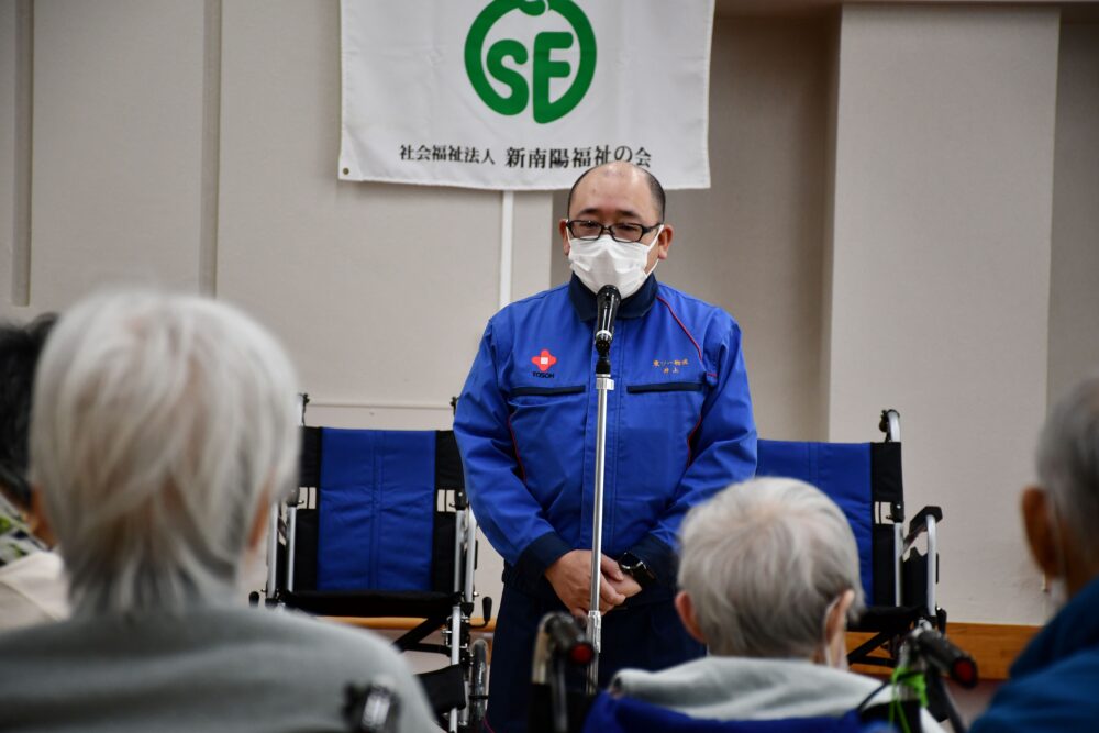 2026年1月19日(月)、東ソー物流労働組合および東ソー物流は、地域貢献活動の一環として、周南市の特別養護老人ホーム福寿荘へ車椅子を2台寄贈いたしました。贈呈式では、東ソー物流労働組合の井上執行委員長が今回の寄贈に至った「プルタブ回収活動」についての紹介と、「皆さまの生活に少しでもお役立ていただければ幸いです」と、利用者の皆さまへの想いを語りました。車椅子を受け取られた社会福祉法人 新南陽福祉の会の弘中理事長からは、「故障している車椅子があり、大変助かります。大切に使わせていただきます」と、感謝のお言葉を頂戴しました。